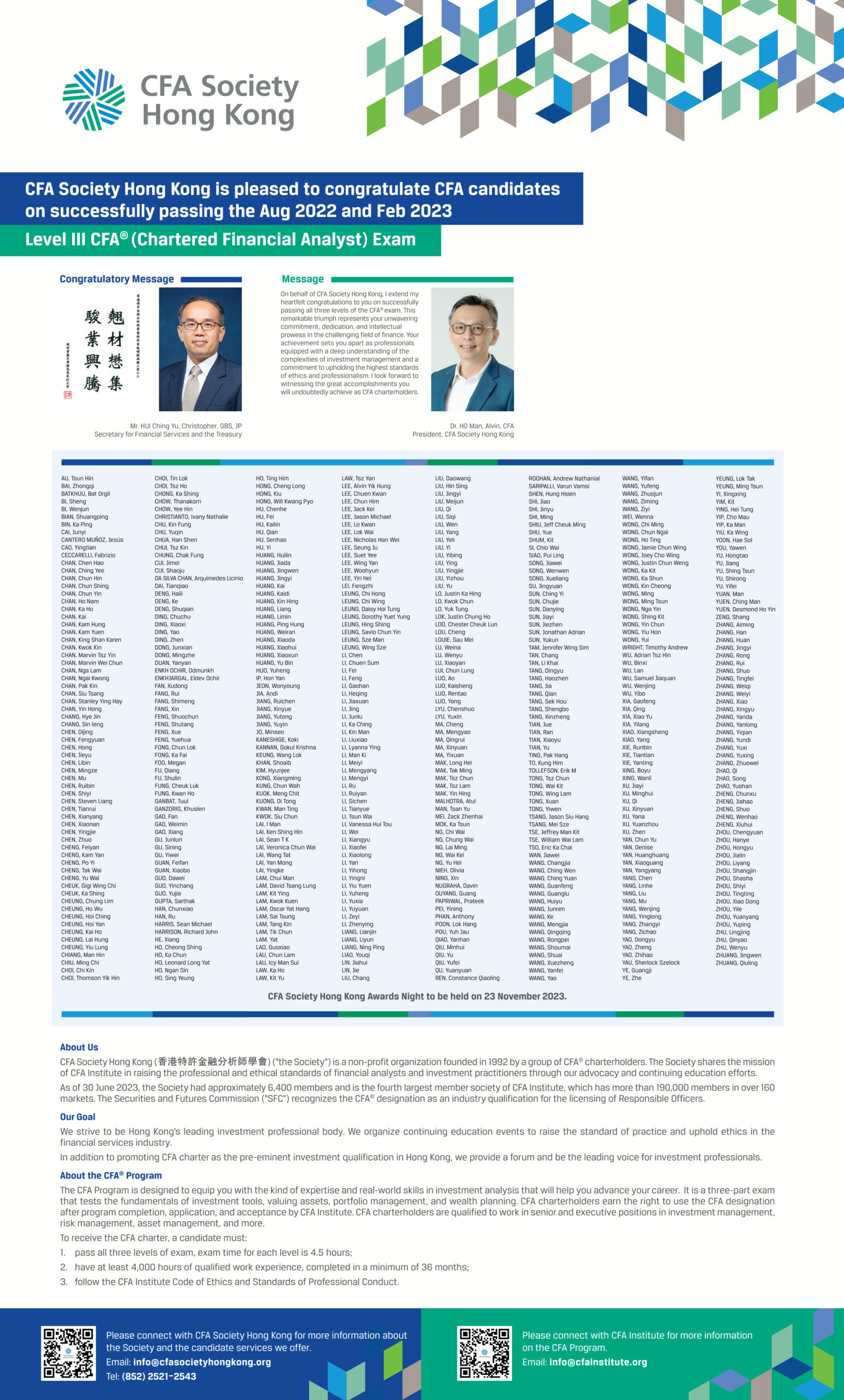 Completing the CFA exams opens countless opportunities in your career and professional development. Therefore, it is our honor to have organized the “Awards Night 2023” celebratory dinner in Nov 2023, commemorating candidates who successfully completed all three levels of the CFA exams and became CFA charterholders in 2022-2023. Over 120 guests and new charterholders were welcomed by a heartfelt and witty opening speech from Dr. Alvin Ho, CFA, President of CFA Society Hong Kong. Our honorable keynote speaker, Mr. Amar Gill, Secretary General Designate of Asian Corporate Governance Association (ACGA), set the tone of the night by sharing how corporate governance and investor engagement contribute to the ethical development of a corporation. We also had the pleasure of having Ms. Brenda Hou, CFA, Head, Global Partnerships & Client Solutions, Growth Markets of CFA Institute, to officiate the charter award presentation ceremony. It was overall a joyous celebration with networking opportunities and free-flowing wine, and we extend our gratitude to UWorld for sponsoring this remarkable event. Share your memorable moments at the Awards Night on social media and go viral with hashtags #CFASocietyHongKong #AwardsNight2023